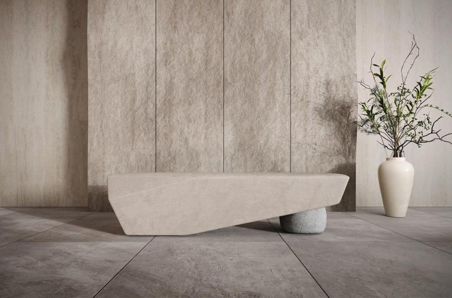 靈感源自自然裂紋岩石的非對稱造型,彷彿風雨雕琢後,岩石靜靜地佇立於小石之上。